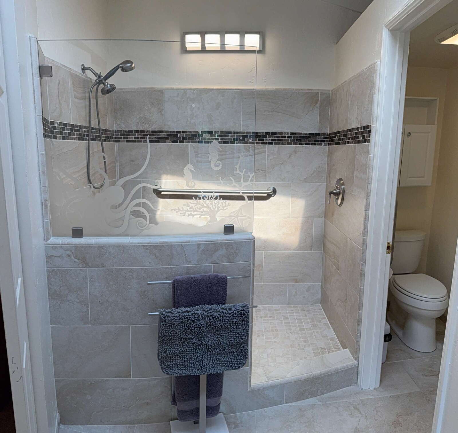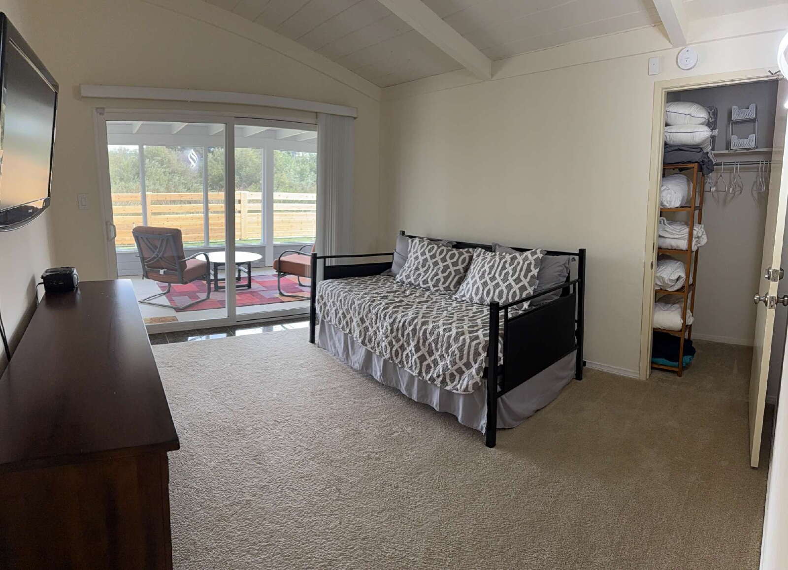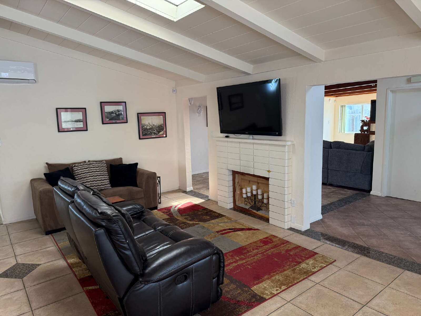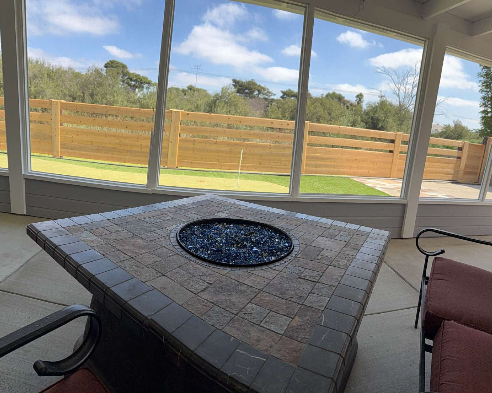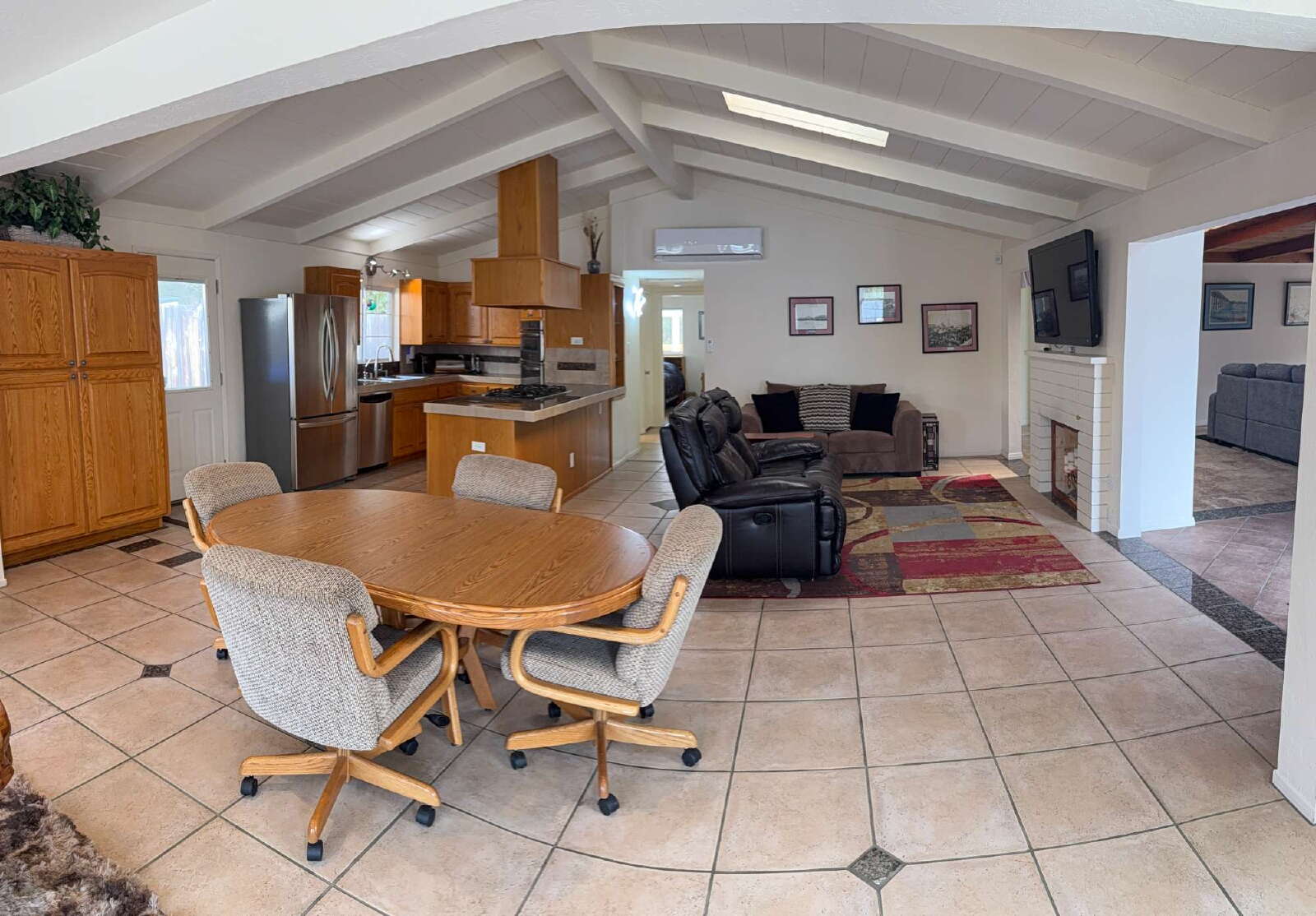 Step inside to an open floor plan with abundant natural light, a remodeled kitchen with beautiful tile counters, custom pull-out drawers, and slow-close cabinetry, plus two updated bathrooms with custom walk-in showers. Bedrooms include a split king (dual adjustable), queen bed, and trundle for flexible living. A private office nook and spacious enclosed sunroom with propane fire-pit create additional areas for work, relaxation, and entertaining.