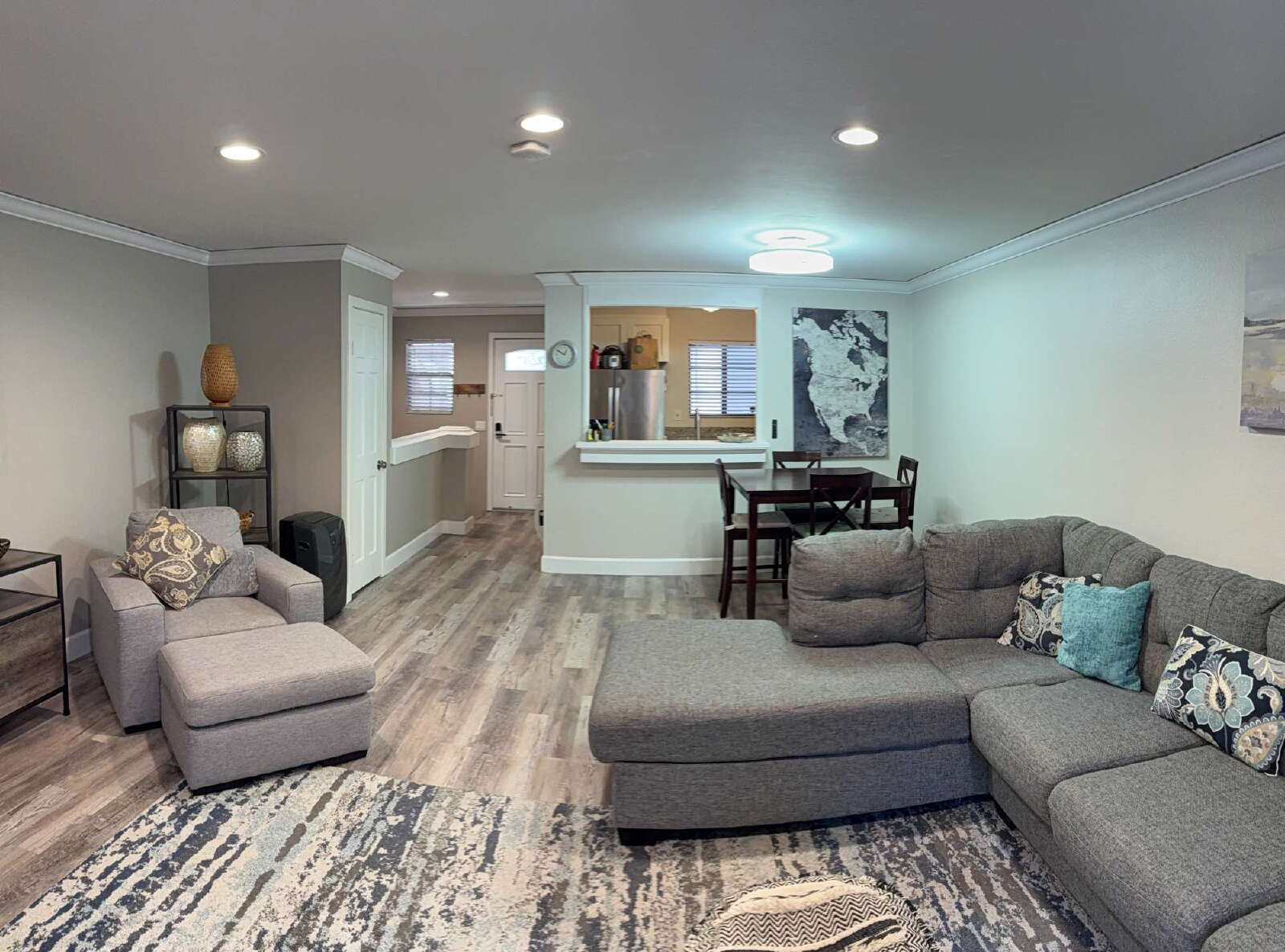 The bright and open living area features luxury vinyl plank flooring, a wood-burning fireplace, and a sectional sofa that converts into a queen sleeper for guests. A private balcony offers a perfect spot to enjoy your morning coffee. The remodeled kitchen boasts granite countertops, updated appliances, and plenty of storage. Upstairs, the primary bedroom includes a queen bed with memory foam mattress and generous walk-in closet space, while the second bedroom features an eastern king bed that can also be configured as two XL twins—ideal for flexible living.