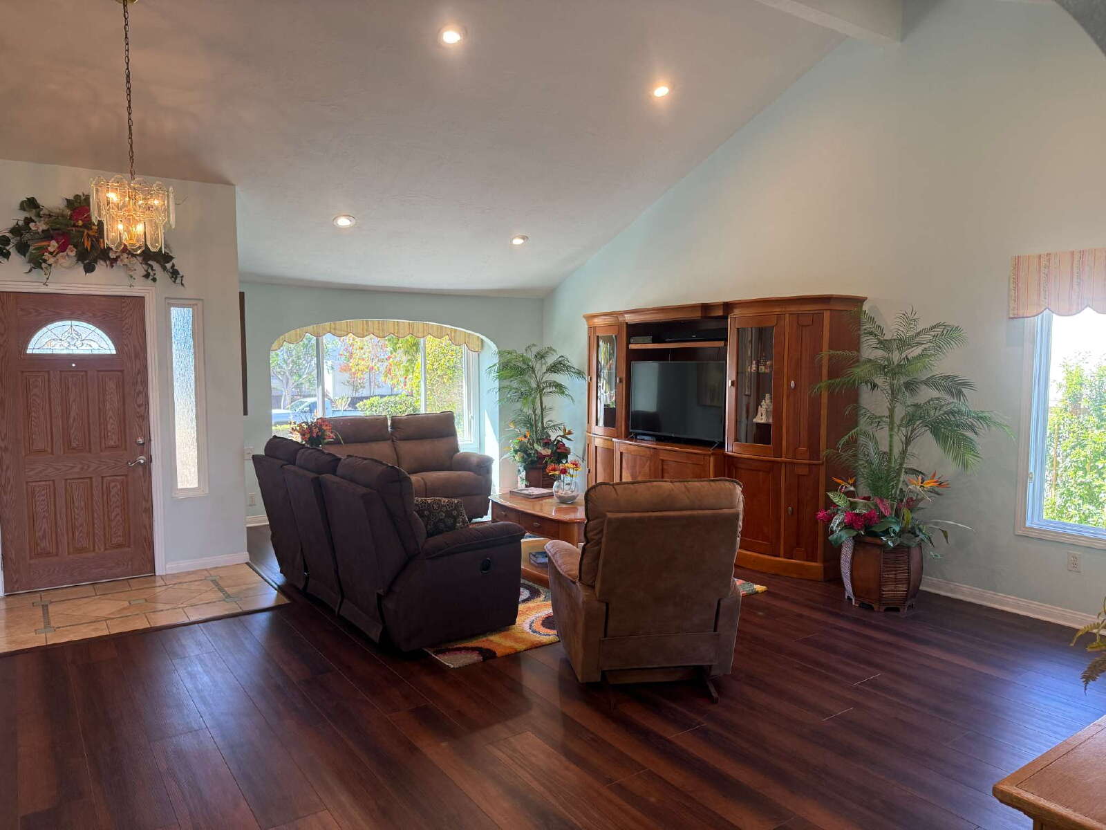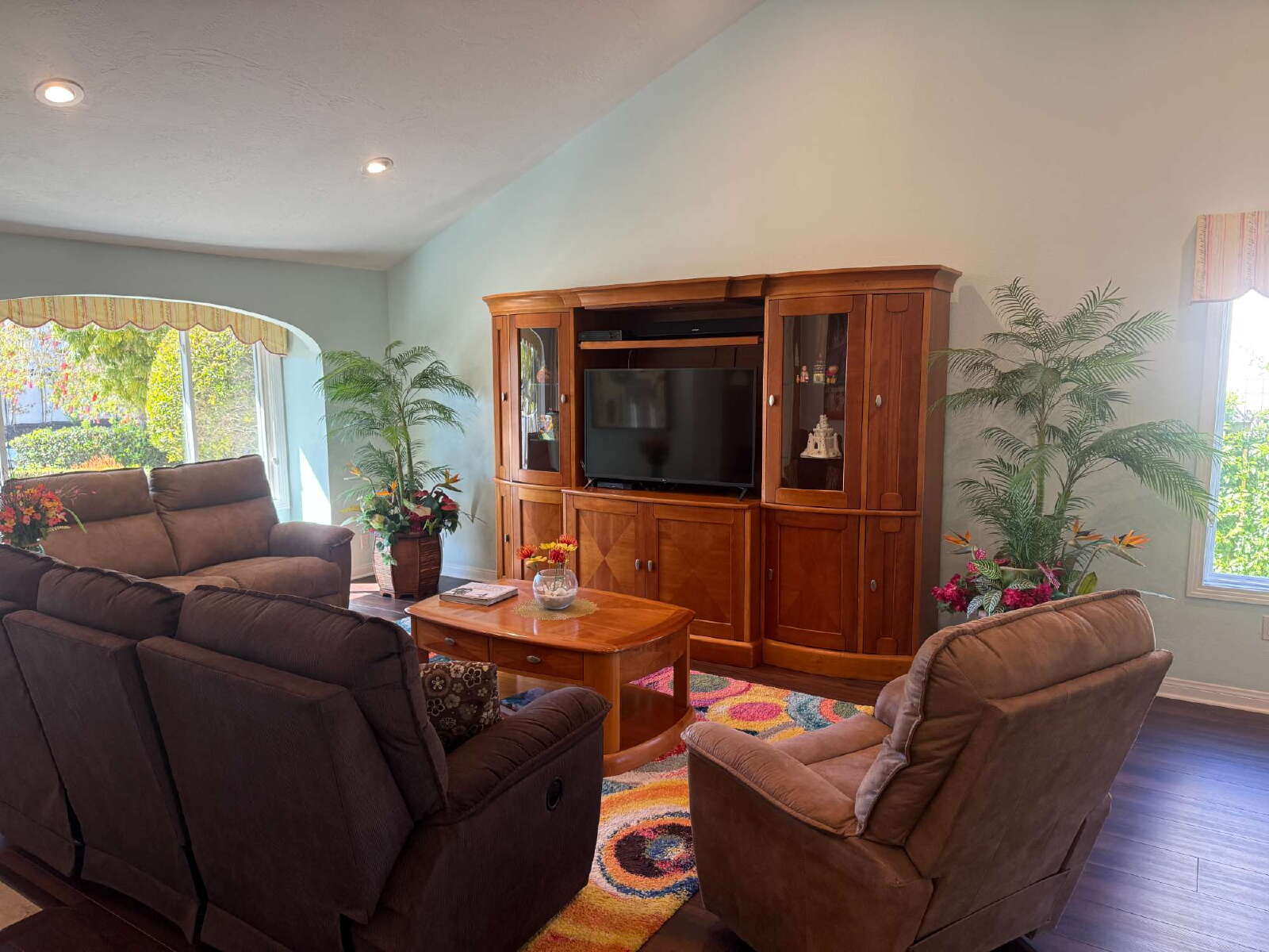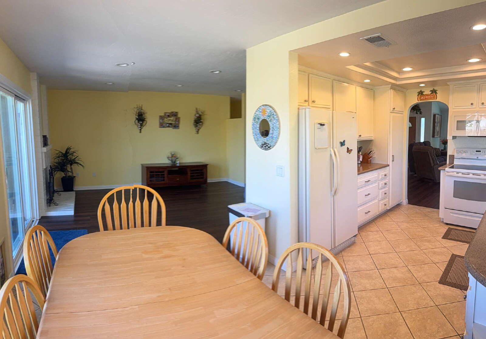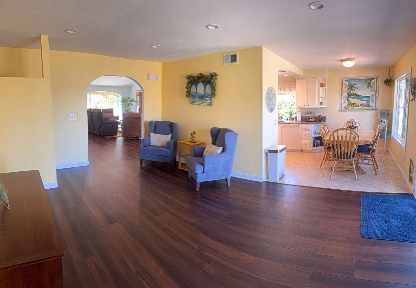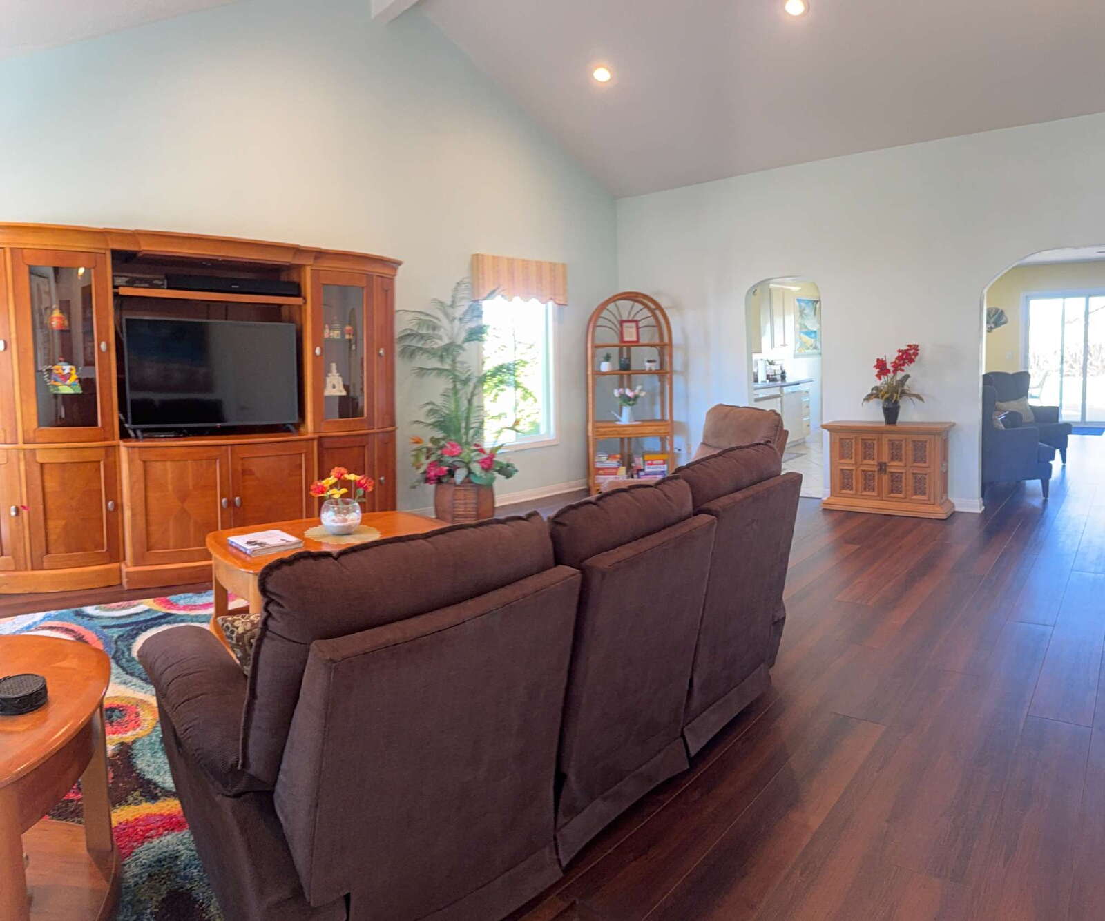 The home features a spacious layout with a large open living room with ample seating and TV entertainment center, plus a separate family room with fireplace and additional seating. A dining table sits just off the kitchen, creating a comfortable space for everyday meals. Washer and dryer are located inside the home along with whole house water filtration system!